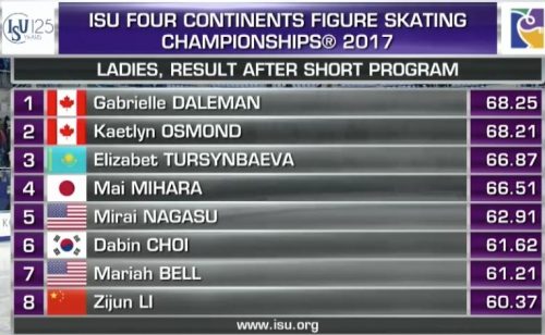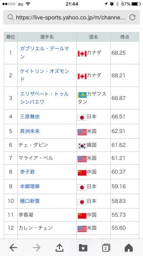 本郷理華は59・16点で9位、樋口新葉は58・83点で10位だった。ガブリエル・デールマンが68・25点で首位に立った。
