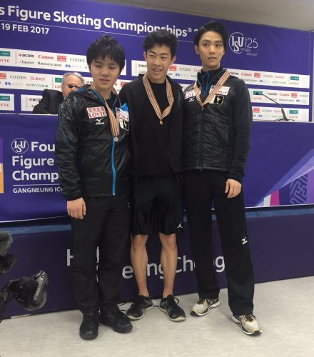 フィギュアスケートの四大陸選手権が17日、韓国の江陵で行われ、男子ショートプログラムでは宇野昌磨(中京大)が自己ベストを更新する100.28点をマークし、2位スタートとなった。羽生結弦(ANA)は97.04点で3位につけた。田中刑事(は77.55点で11位。103.12点を出したネイサン・チェンが首位に立った。