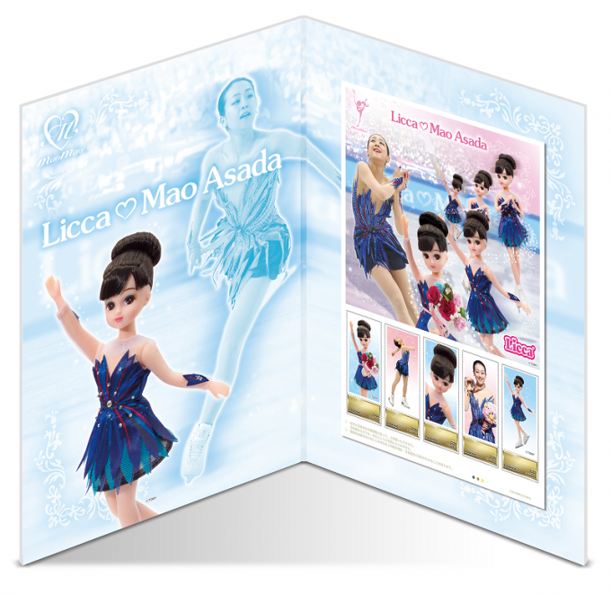 本商品は、リカちゃん人形、スケートシューズ、花束、スタンドをスペシャルBOXに収納し、華やかに演技するリカちゃんと浅田真央選手がコラボレーションしたフレーム切手シートを、特製ホルダーに収めたものです。