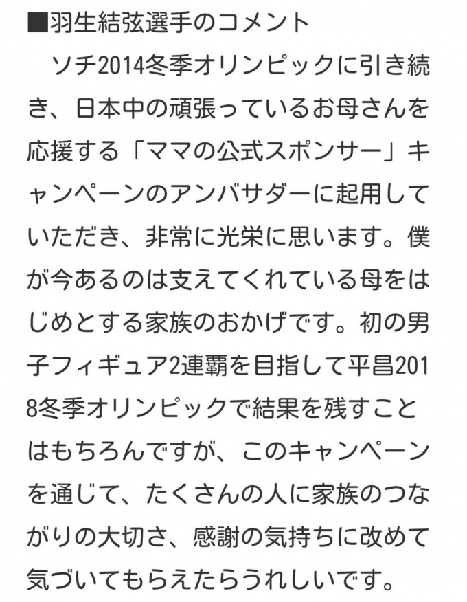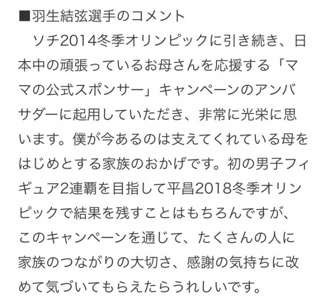 ソチ2014冬季オリンピックに引き続き、日本中の頑張っているお母さんを応援する「ママの公式スポンサー」キャンペーンのアンバサダーに起用していただき、非常に光栄に思います。僕が今あるのは支えてくれている母をはじめとする家族のおかげです。初の男子フィギュア2連覇を目指して平昌2018冬季オリンピックで結果を残すことはもちろんですが、このキャンペーンを通じて、たくさんの人に家族のつながりの大切さ、感謝の気持ちに改めて気づいてもらえたらうれしいです。