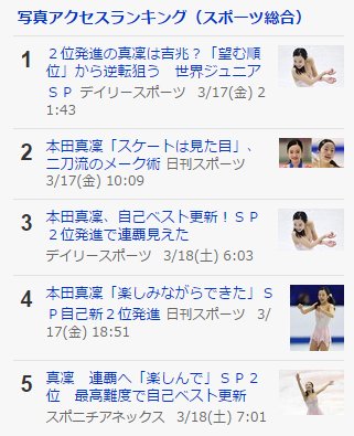 Yahooニュース、写真スポーツ総合のアクセスランキングのTOP5が全部本田真凜