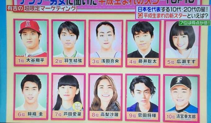 ヒルナンデス見てたけど、平成生まれのスターの二位が羽生さん、三位が真央ちゃんだったね。一位が大谷くん。