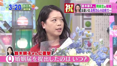 鈴木明子さんが結婚。2月1日に婚姻届提出していた事をテレビで生報告。お相手は小学校時代の同級生