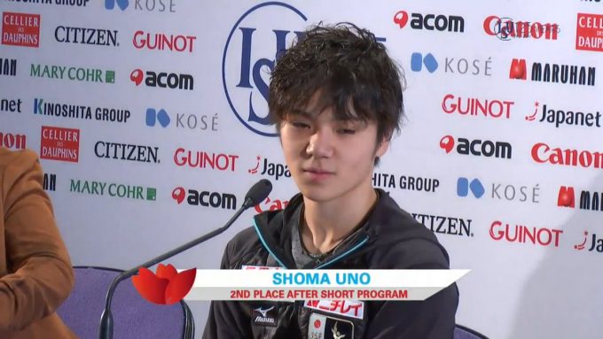 18年平昌五輪の出場枠をかけた大会で、男子SPが行われた。全日本選手権を制した宇野昌磨(19)=中京大=は104・86点で2位につけた。ほぼノーミスの演技で昨季のGPファイナルで羽生が出した世界歴代最高得点(110・95)に次ぐ歴代2位の高得点だったが、後に演技したハビエル・フェルナンデス(スペイン)が109・05点を記録し、トップは譲った。