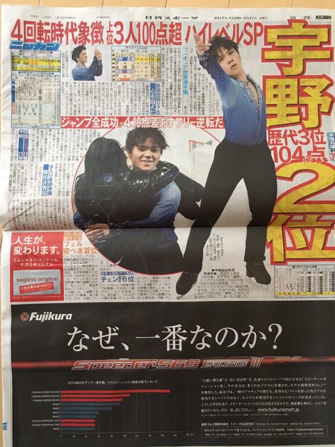 宇野昌磨(19)=中京大=は世界歴代3位の104・86点で2位。四大陸選手権に続き、SPで羽生を上回った。男子フリーは4月1日に行われる。