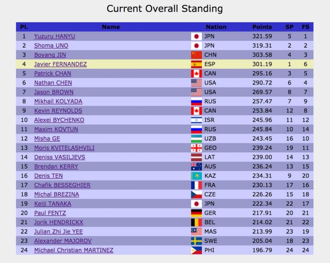 SP4位の金博洋(中国)がフリー204.94点、合計303.58点で2年連続の銅メダル。SP首位のハビエル・フェルナンデス(スペイン)はフリーでジャンプの失敗があり192.14点、合計301.19点で4位に終わり、2011~13年のパトリック・チャン(カナダ)以来となる3連覇を逃した。SP22位の田中刑事(倉敷芸術科学大大学院)は合計222.34点で19位だった。