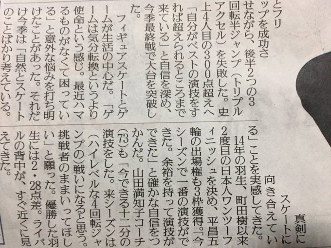 「フィギュアスケートとゲームが生活の中心だ。『ゲームは気分転換というより使命という感じ。最近はまるものがなくて困っている』と意外な悩みを打ち明けたことがあった。」