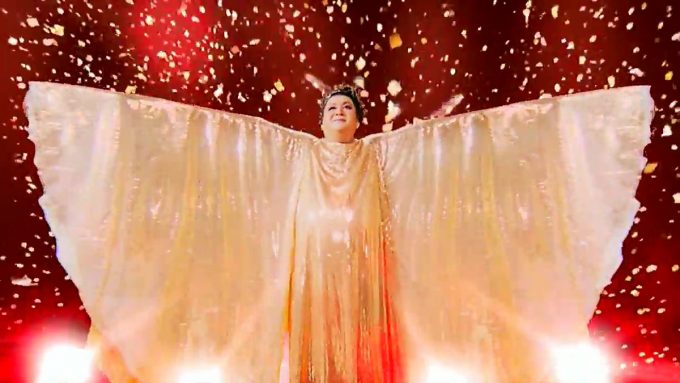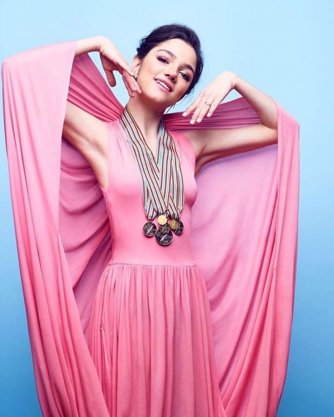 メドベージェワが奇抜な衣装を着て華麗なポーズ。飾られているメダルが何処か誇らしげ