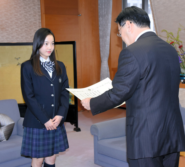 来庁時には、大勢の職員の出迎えを受け、照れくさそうに小走りした本田。山田啓二知事から表彰状を受け取り「素晴らしい賞をいただけて本当にうれしく思っています」とはにかんだ。