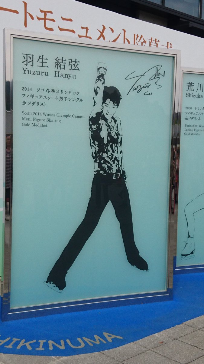 仙台市内の「五色沼」は日本のフィギュアスケートの発祥地とされており、男女ペアのスケーターの像と碑が立っている。今回はさらに、仙台ゆかりの金メダリスト2人の偉業を記念し、地下鉄国際センター駅前にモニュメントが設置された。2枚のガラス板には、羽生のショートプログラム(SP)「パリの散歩道」のフィニッシュポーズ、荒川さんのイナバウワーをする姿、それぞれの五輪の名場面が刻まれた。