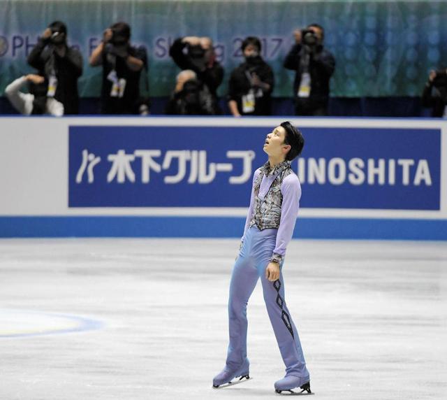 日本チームの前でジャンプの着氷に失敗する羽生(手前)