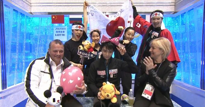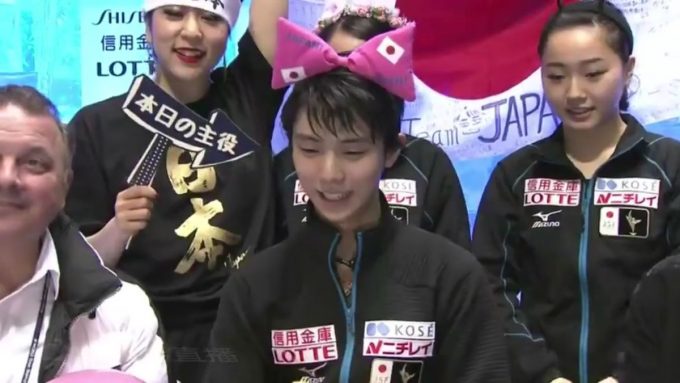 可愛すぎ(笑)フリー演技が終わり応援席で羽生結弦がリボンカチューシャを付けるとこうなる