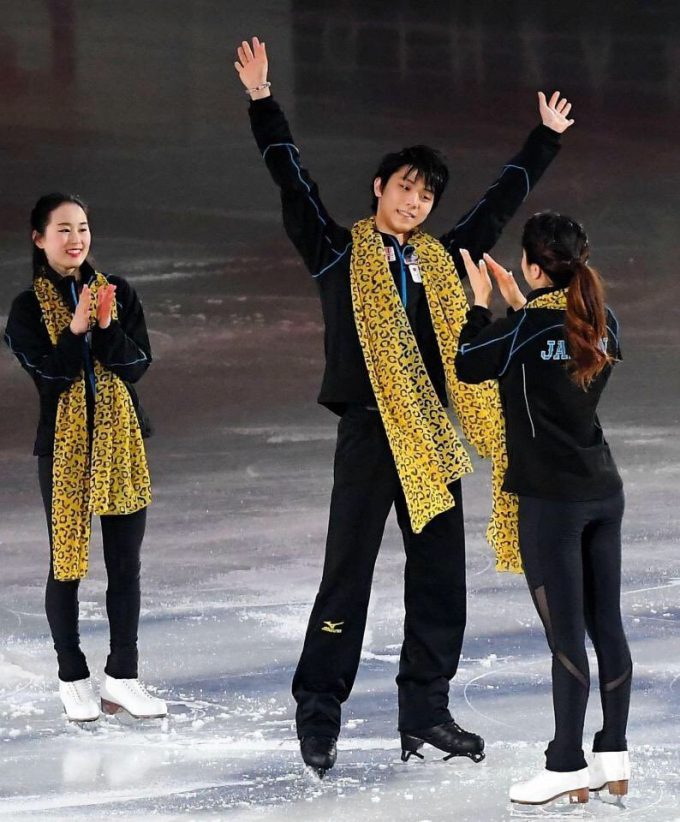 羽生結弦(ANA)ら日本代表全員が氷上に登場すると、“本家”さながらに黄色のヒョウ柄のスカーフを首元に巻き、ノリノリで会場を沸かせた。