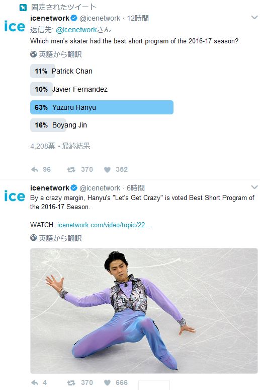 投票結果を受け、「アイスネットワーク」は「“クレイジー”な大差でハニュウの『レッツゴー・クレイジー』が2016-17年のベストショートプログラムに選出」とツイート。曲名とかけ、羽生の圧勝をレポートしている。