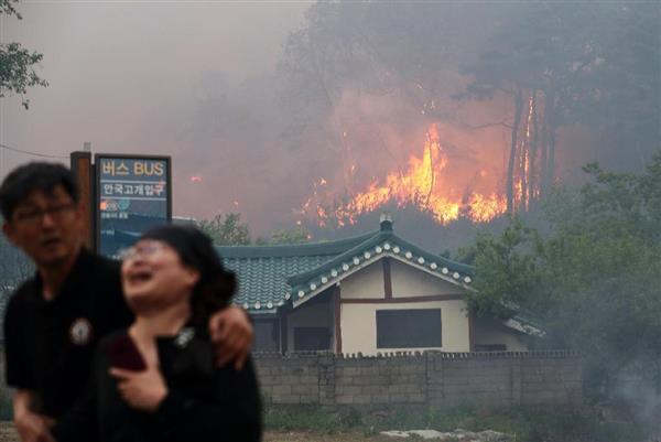 韓国東部江原道江陵で6日午後(日本時間同)に山火事が発生、強風で燃え広がり、聯合ニュースによると家屋など14棟が焼損、住民ら約300人が付近の学校に避難した。6日夜の時点で鎮火しておらず、被害が拡大する恐れもある。