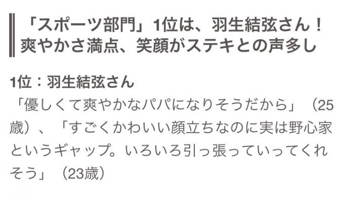 「スポーツ部門」1位は、羽生結弦さん!爽やかさ満点、笑顔がステキとの声多し