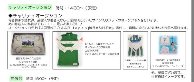 有名騎手や調教師、芸能人や著名人からご提供いただいたサイン入りグッズのオークションを行います。