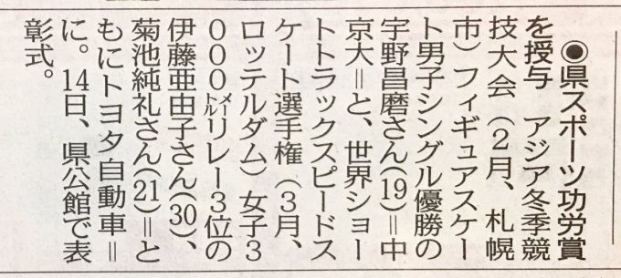 中日新聞記事より。昌磨君、県スポーツ功労賞の授与式が6/14に愛知県公館であるようです。