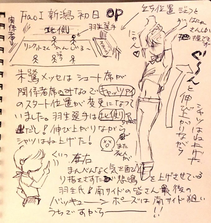 第一部終わりました。取り急ぎ、OPレポ。羽生選手はキャッツアイ北側からスタート!本日も死者多数!!!左右まんべんなくゆびさし、悲鳴の嵐!最後はバッキューンであご、指クイッ!