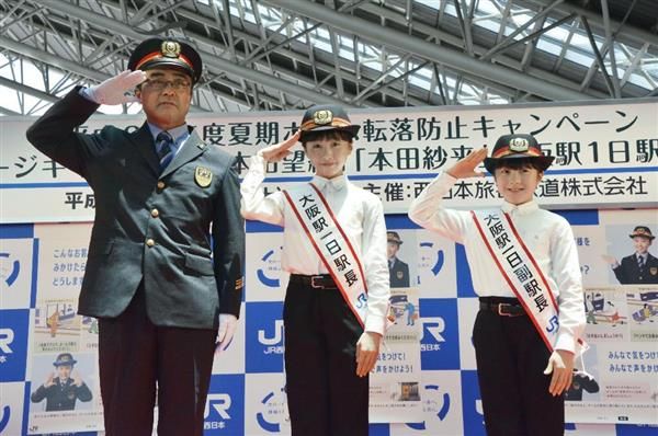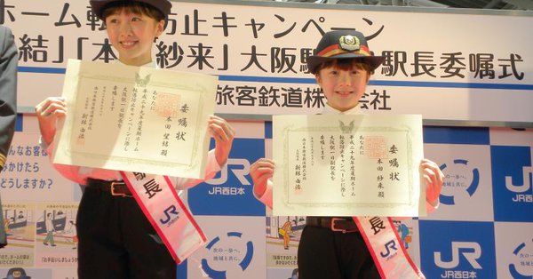 JR西日本の「ホーム転落防止キャンペーン」の一環として開かれたイベントでは、大阪駅の一日駅長に就任した本田望結さんと妹の紗来さんが、声かけの大切さを呼びかけました。