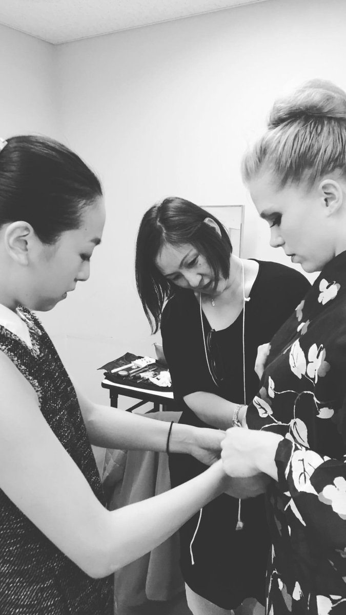 楽屋裏でメアリーポピンズの上着を交換ごっこする仲良し過ぎる4人(o^^o)どの組み合わせが合うのかこの後まだまだ永遠に(笑)(爆)
