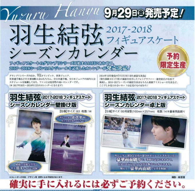 【新刊予約:実用】『羽生結弦シーズンカレンダー 2017‐2018 壁掛け版、卓上版』(集英社、本体価格 壁掛け版2300円、卓上版2000円)