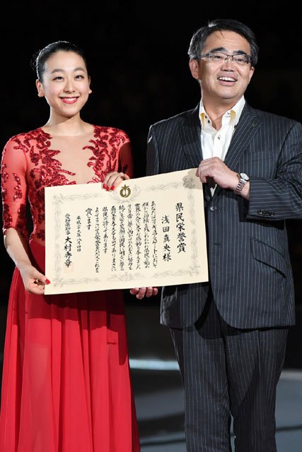 4月に引退した元フィギュアスケート選手浅田真央さん(26)が4日、名古屋市内で愛知県民栄誉賞および名古屋市特別スポーツ功労賞を授与された。この日始まった「ザ・アイス」名古屋公演の合間に、氷上で授賞式を行った。