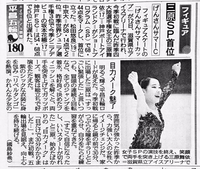 フィギュアスケートの「げんさんサマーカップ」が12日、滋賀県立アイスアリーナで行われ、昨季の四大陸選手権女王・三原舞依(17)=神戸ポートアイランドク=が今季初戦に臨み、ショートプログラム(SP)で68・44点をマークして首位発進を決めた。坂本花織(17)=神戸FSC=はミスが続き、5位と出遅れた。