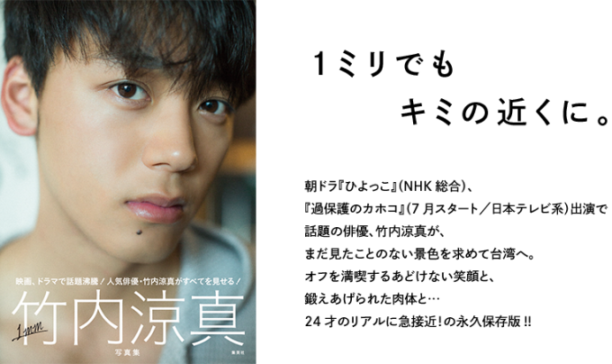 NHK連続テレビ小説『ひよっこ』、日本テレビ系ドラマ『過保護のカホコ』(毎週水曜 後10:00)で人気急上昇中の竹内。発売前から重版が決定したという同作は、「1mmでも君の近くに。」をテーマに台湾で撮影され、絶景や絶品を満喫する笑顔やプールでの肉体美などが収められている。