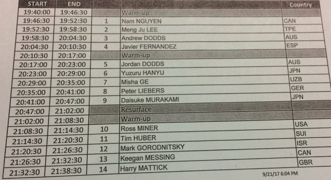 フィギュアスケートのオータムクラシックの男子SP滑走順です。羽生結弦選手は14人中6番目。村上大介選手は9番目、フェルナンデス選手は4番目です pic.twitter.com/4yPS1x1ue1