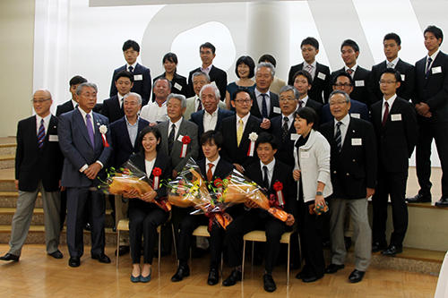 23日の激励会には宇野選手のほか、フリースタイルスキーモーグルで今年1月の世界選手権を制した堀島行真選手や、卒業生の伊藤みき選手も出席しました。