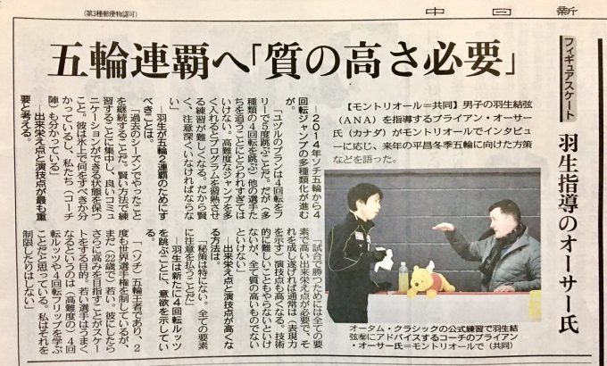 フィギュアスケート男子の羽生結弦(22)=ANA=を指導するブライアン・オーサー・コーチ(カナダ)がモントリオールでこのほどインタビューに応じた。1948~52年大会のディック・バトン以来66年ぶりの五輪連覇が懸かる2018年平昌大会に向けた方策などを語った。