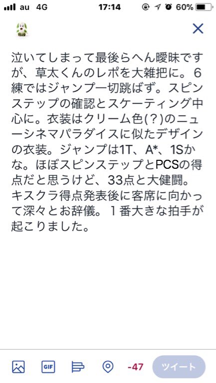 1T、A、1T。状態があがってない中大会に出場してくれた心意気に涙が…。イーグルでは会場から大きな拍手。よく出場してくれました。なにかを示唆したものでないことを祈ります。33.05。