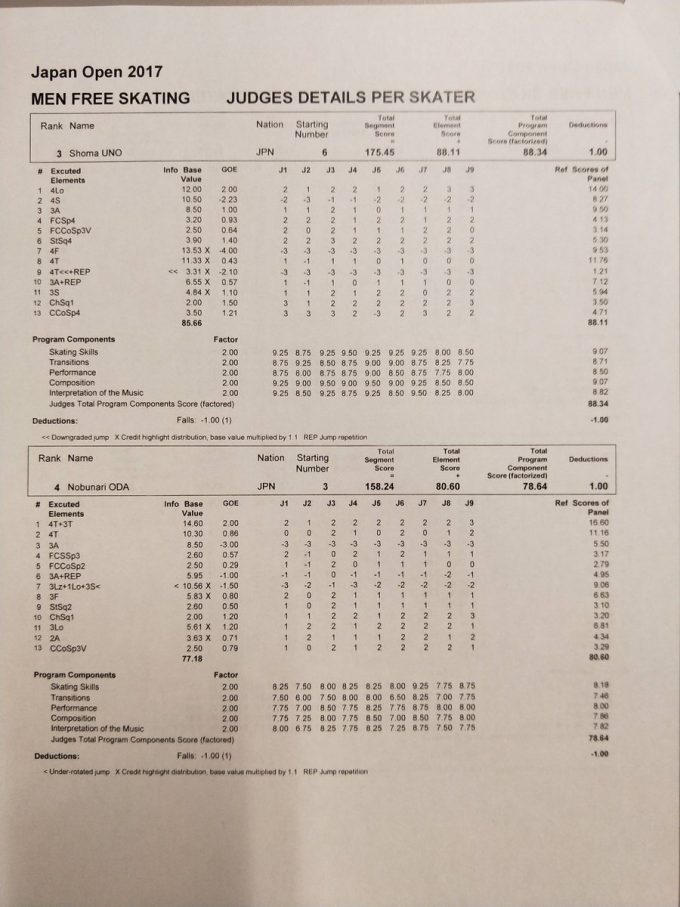 宇野昌磨選手は「練習でもここまで失敗しないと思うのですごく悔しい。後半の4回転フリップは、着氷したと思ったが、転倒して気持ちの崩れにつながった。自分でコントロールできなかった。ジャンプは演技の前半に挑戦して、後半は安定して絶対に跳ばないといけないが緊張もあって、跳べるジャンプを失敗してしまった。練習が悪かったと思うのでこの悪い試合を生かして取り組んでいきたい」と話して雪辱を誓っていました。