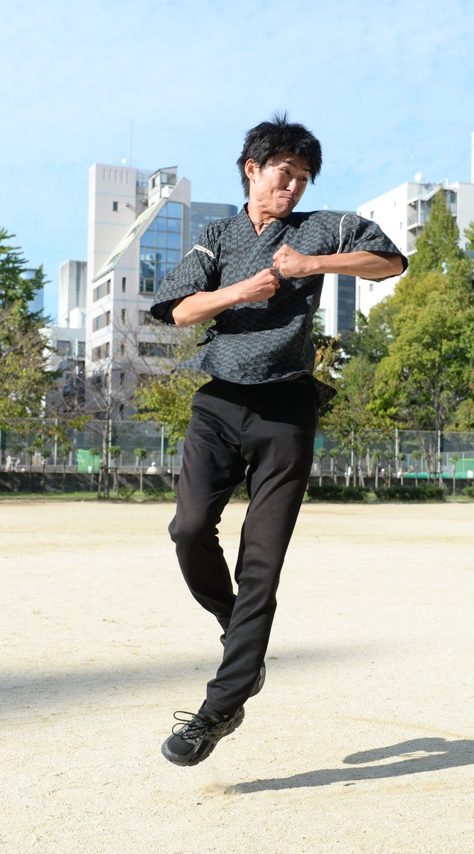 オフィス街の中心に位置する大阪・靱公園。「和」を意識した衣装の川崎さんは、ゆっくりと右手の指を胸の前で立てた。羽生が取り組む「SEIMEI」の最初のポーズで「この指の使い方は他の作品にはない。非日常的な動きで、一瞬にして入り込めます」と演技が始まった。砂の上のため、ジャンプは2回転。スピンはその場でピタリと止まった。滑らかなステップに、愛犬を散歩中の中年女性も足を止めた。