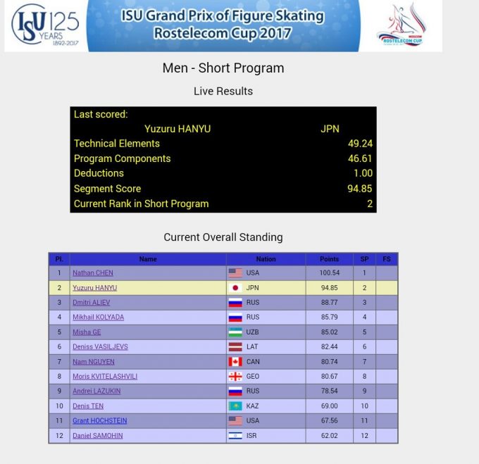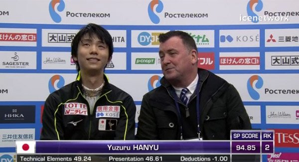 フィギュアスケート・グランプリ(GP)シリーズ第1戦ロシア杯(20日、モスクワ)男子ショートプログラム(SP)で、ソチ五輪金メダルの羽生結弦(22)=ANA=は94・85点で2位だった。ネイサン・チェン(18)=米国=が100・54点で首位発進した。フリーは21日に行われる。