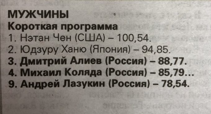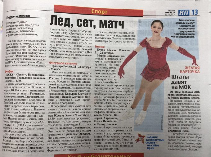 新聞買ってみました。メドベちゃんがドカンと出てます。羽生くんは文字だけ。ロシア語読めないから全然分からないけど記念に