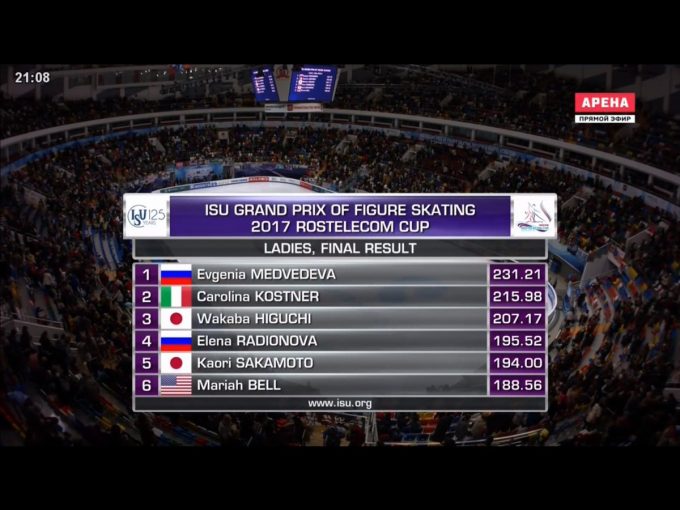 SP首位のエフゲニア・メドベージェワ(17=ロシア)がフリーも1位の150・46点、合計231・21で優勝。世界女王の貫禄を見せた。2014年ソチ五輪銅メダリストのカロリーナ・コストナー(30=イタリア)がフリー2位の141・36点、合計215・98で2位となった。