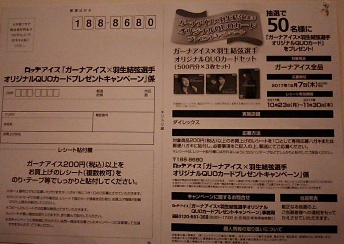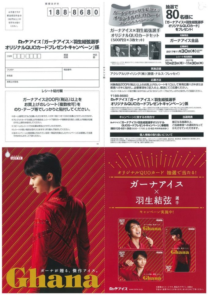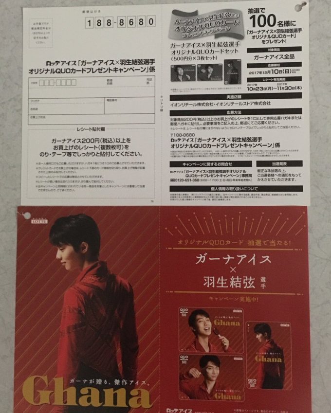 羽生結弦オリジナルクオカードが当たるガーナアイスキャンペーン。応募して何とか手に入れたい