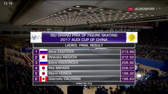 中国杯2017。優勝はロシアのアリーナ・ザギトワ。樋口新葉は渾身の演技で2位に。三原舞依は4位、本田真凜は5位でフィニッシュ