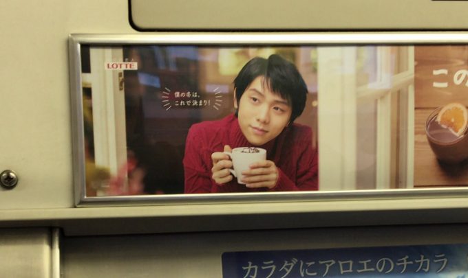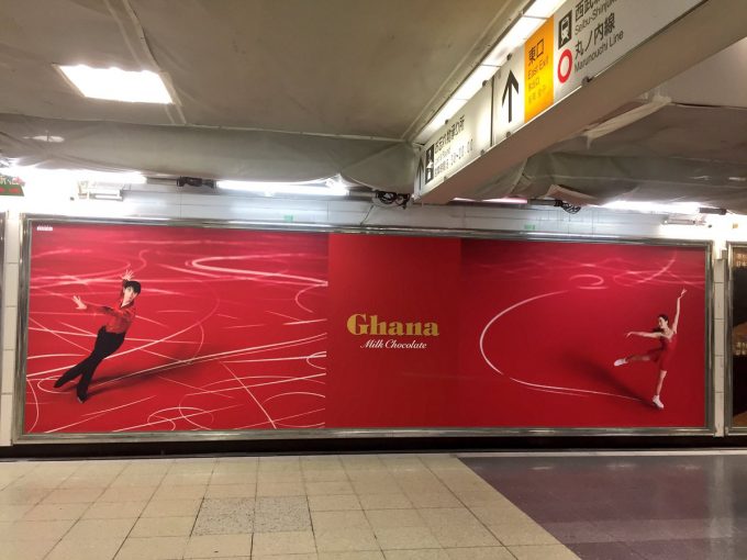 JR新宿駅の西口改札入ってから東口改札に抜ける通路にガーナゆづ。左は羽生くん、右はまりんちゃん