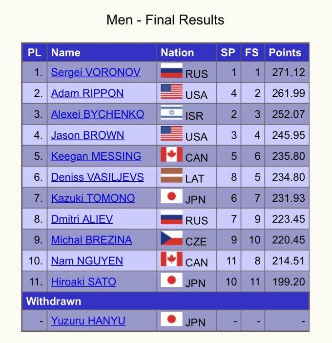 ロシアの30歳のベテラン、ボロノフが前日のSPに続いて会心の演技を見せ、GPシリーズ初勝利を挙げた。4-3回転トーループは高さもあり、出来栄え評価(GOE)で2.14点の加点を得た。もう1本の4回転トーループも着氷は完璧ではなかったが、何とか降りた。他のジャンプも安定。壮大な曲に乗った演技は円熟味があり、観客を魅了した。取材ゾーンでは開口一番、日本語で「ツカレター」と笑わせて「私ができることは全てやった。みなさんの応援を受けて、やり終わった感動に浸っている」と満足そうな表情。2006~07年シーズンにGPシリーズに参戦してから12年目の初勝利に「優勝できて幸せ」と喜びもひとしおだった。