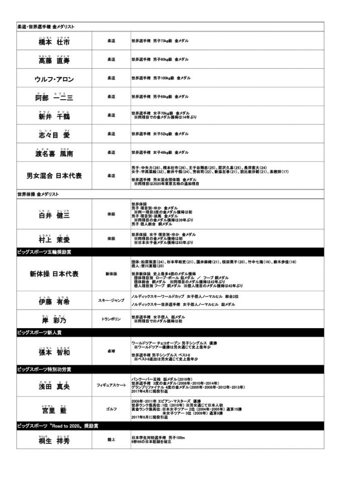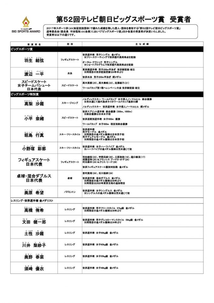2017年のスポーツ界で優れた成績を残した個人や団体に贈られる「テレビ朝日ビッグスポーツ賞」が21日に発表され、フィギュアスケート男子で世界選手権を制した羽生結弦(ANA)、競泳男子200メートル平泳ぎで1月に世界記録を樹立した渡辺一平(早大)、今月のスピードスケート・ワールドカップの女子団体追い抜きで世界新記録の日本代表(高木菜那、高木美帆、佐藤綾乃)が選ばれた。