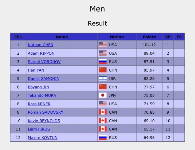 スケートアメリカ大会2017。男子SP首位はネイサン・チェン。無良崇人は75・05点で7位。