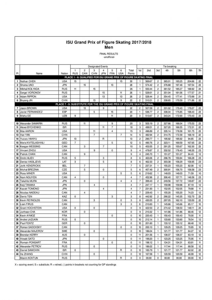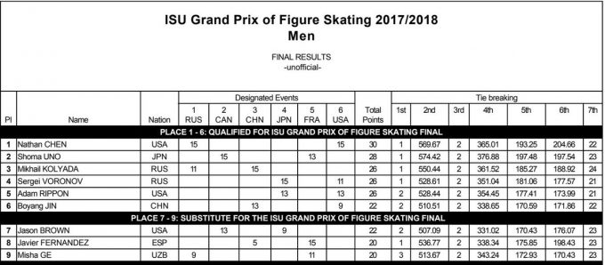 男子はGP全戦を終え、ファイナル進出者はチェン、宇野昌磨(トヨタ自動車)、コリャダ(ロシア)、ボロノフ、リッポン、金博洋(中国)の6人。今大会4位の金博洋は米国のブラウンと22点で並んだものの、シリーズ出場2戦での合計点で上回った。