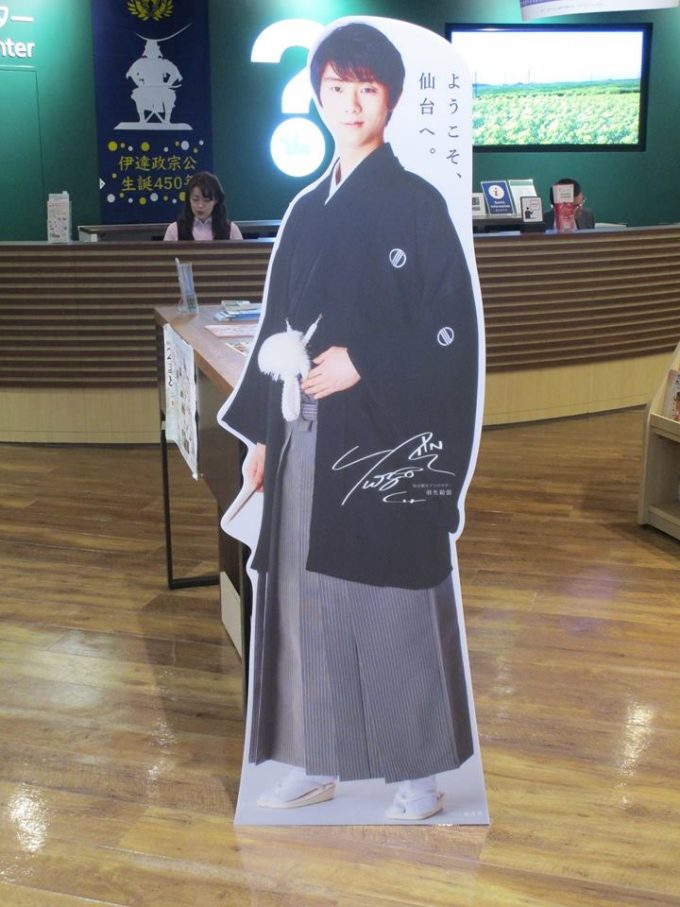 設置場所はJR仙台駅構内の市観光情報センターと、泉区高玉町のアイスリンク仙台展示スペース。パネルは高さ1.7メートルで、はかまの最高峰ブランドとされる仙台平を着用した羽生選手の観光PRポスター用写真を活用した。