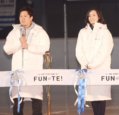 アイスリンク仙台のリニューアル完成披露セレモニーに登場した荒川静香(右)と本田