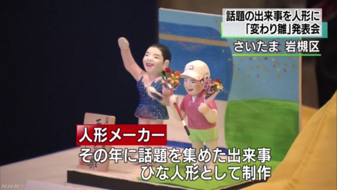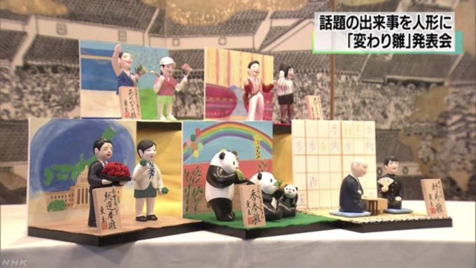 さいたま市岩槻区の人形メーカー「東玉」は5日、今年の世相を反映した変わりびな5点を発表した。東京・上野動物園で今年生まれたジャイアントパンダの子ども、シャンシャン(香香)や、将棋で最多の29連勝を達成した中学生プロ、藤井聡太四段などが取り上げられた。