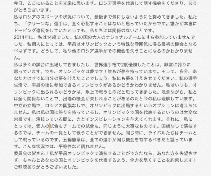 ロシアの出場停止が決定される前のスピーチなので、実際に中立の立場の選手として出場する可能性については、現時点では不明ですが…