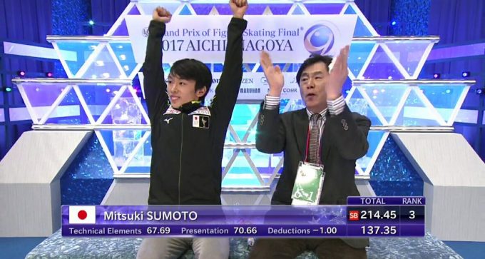 得点が表示され、3位が確定すると、立ち上がり観客に何度も頭を下げ、感謝の思いを表現した。ミックスゾーンでは、「(演技は)少し空回りしたけど、お客さんの力で最後まで滑ることができた。夢のような感じでした。表彰台に乗れると思っていなかったので、大きな自信になった」と話した。